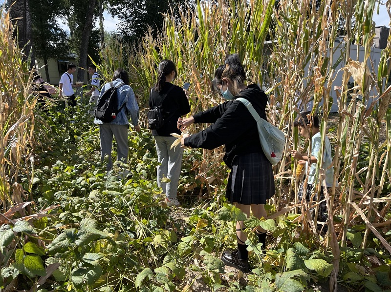 活动在中国农业博物馆的“玉米大豆带状复合种植展示区”举办,展示区里玉米金黄、豆荚饱满。社教部朱一鸣结合现场农作物和科普展板,从玉米、大豆的起源入手,给同学们讲述了秋分节气文化、农作物基础知识、带状复合种植技术要点及其对于国家粮食安全的特殊意义。接着,又详细介绍了玉米、大豆是集粮食、饲料和加工于一体的重要农作物,也是我国缺口最大的农产品,实行带状复合种植可以有效解决两者之间的争地矛盾,在玉米不减产的情况下,多收一季大豆,实现双丰收,提高农民收入,是保障国家粮食安全的一项重要措施。随后,同学们走进植株间,近距离观察作物形态特点,争先恐后地摘下玉米和大豆,亲手体验收获的快乐。