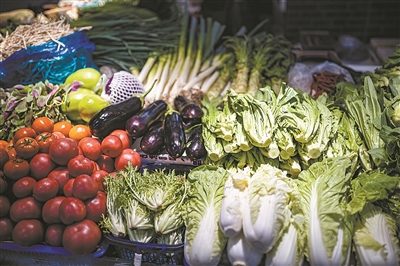 在浙江绍兴某菜场内,蔬菜供应品种多样。