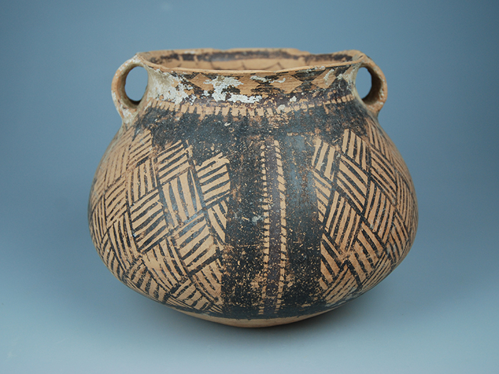 藏品-陶器-彩陶-农耕与编织(编织)-席纹带纹双耳罐 半山文化类型 高14厘米 直径18厘米