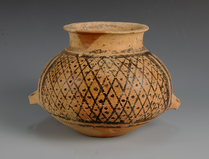 藏品-陶器-彩陶-农耕与编织(农耕)-种子纹网格纹双耳罐 马家窑文化类型 高15厘米 腹径16厘米