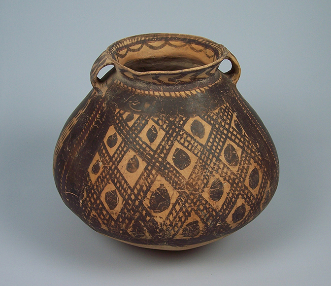藏品-陶器-彩陶-农耕与编织(农耕)-种子纹网格纹双耳罐 半山文化类型 高26厘米 腹径33厘米