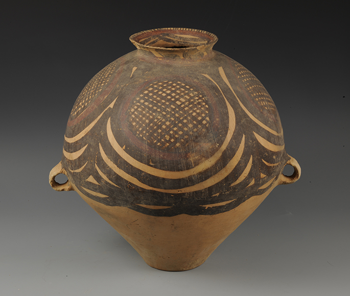藏品-陶器-彩陶-农耕与编织(农耕)-四大圈纹网纹双耳罐 马厂文化类型 高38厘米 腹径36厘米