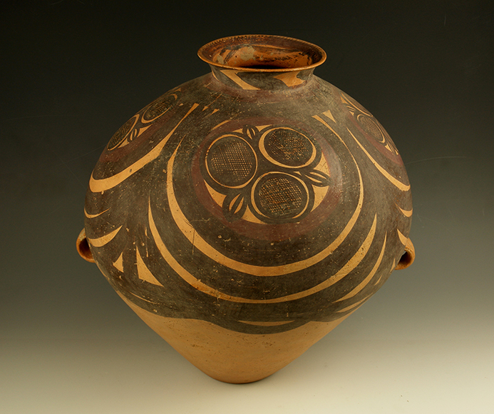 藏品-陶器-彩陶-渔猎与采集(采集与种植)-叶纹四大圈纹双耳瓮 马厂文化类型 高41厘米 腹径38厘米
