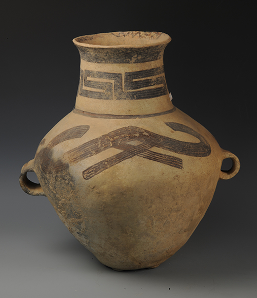 藏品-陶器-彩陶-渔猎与采集(狩猎与畜牧)-犬纹回纹双耳罐 辛店文化类型 高42厘米 腹径35厘米