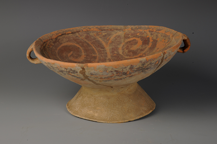 藏品-陶器-彩陶-渔猎与采集(狩猎与畜牧)-蛇形纹双耳豆 马厂文化类型 高8厘米 口径9厘米