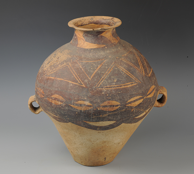 藏品-陶器-彩陶-渔猎与采集(捕捞与结网)-贝纹折带纹双耳罐 马厂文化类型 高38厘米 腹径34厘米