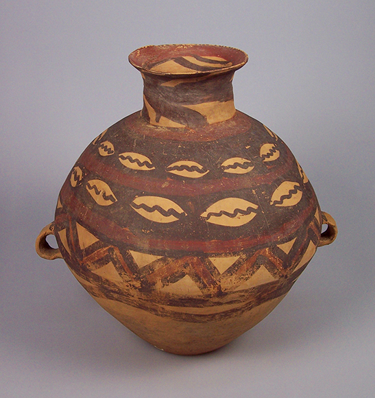 藏品-陶器-彩陶-渔猎与采集(捕捞与结网)-贝纹带纹双耳罐 马厂文化类型 高30厘米 腹径28厘米