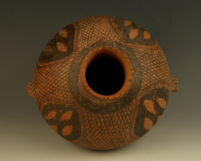 藏品-陶器-彩陶-渔猎与采集(捕捞与结网)-网纹叶形纹双耳壶 半山文化类型 高34厘米 腹径28厘米