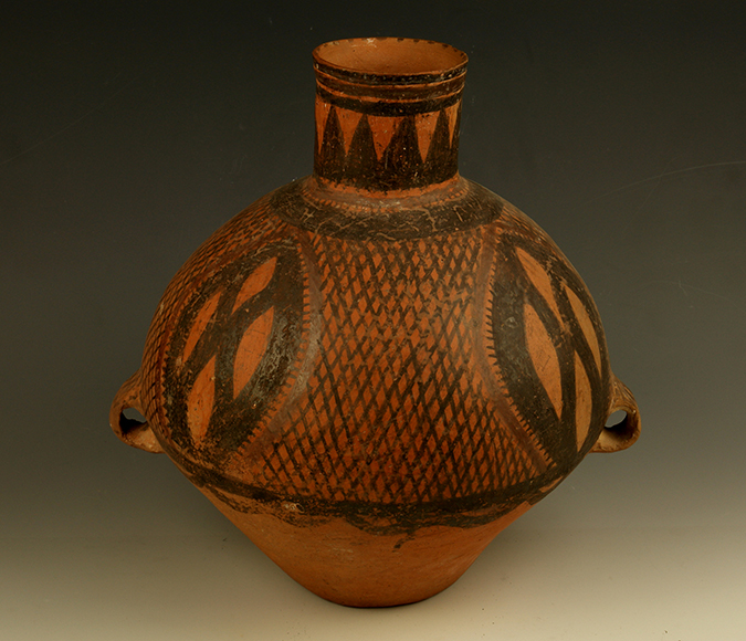 藏品-陶器-彩陶-渔猎与采集(捕捞与结网)-网纹叶形纹双耳壶 半山文化类型 高34厘米 腹径28厘米