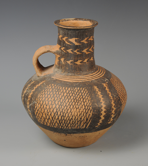 藏品-陶器-彩陶-渔猎与采集(捕捞与结网)-网纹蜥蜴纹单耳壶 马家窑文化类型 高21厘米 口径8厘米
