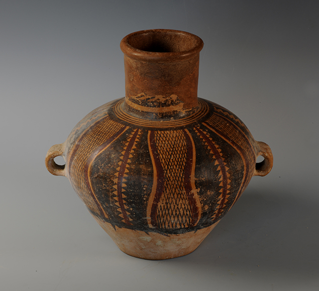 藏品-陶器-彩陶-渔猎与采集(捕捞与结网)-网纹齿带纹双耳壶 半山文化类型 高22厘米 腹径22厘米
