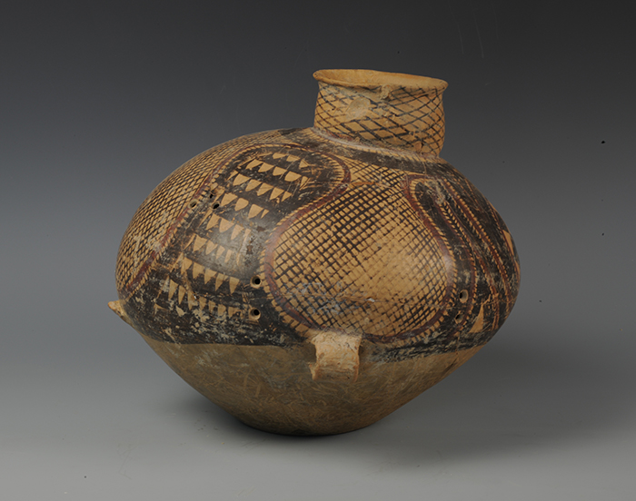 藏品-陶器-彩陶-农业与自然崇拜(鸟禽)-网纹齿带纹双耳鸟形壶 半山文化类型 高23厘米 腹径26厘米