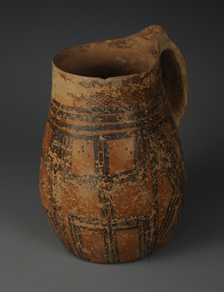 藏品-陶器-彩陶-农业与自然崇拜(神蛙、神人)-人面刻纹几何纹单耳杯 马厂文化类型 高24厘米 口径12厘米