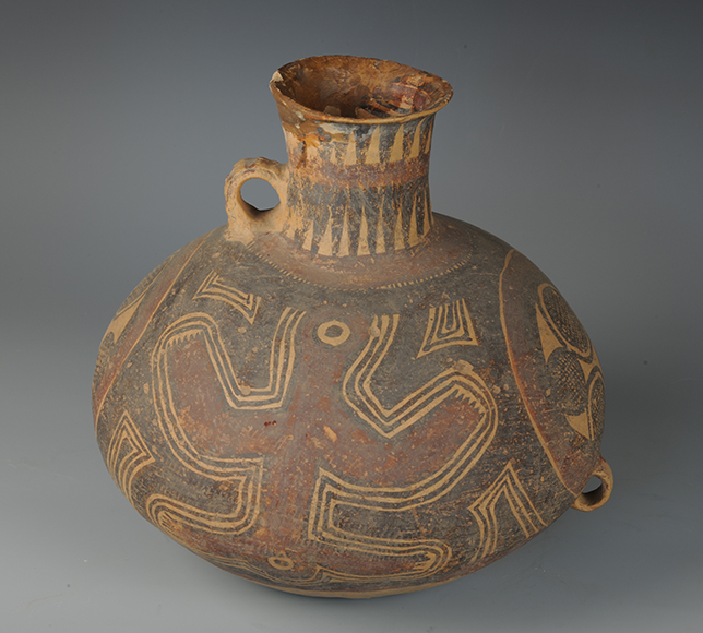 藏品-陶器-彩陶-农业与自然崇拜(神蛙、神人)-神人纹球纹高低耳壶 马厂文化类型 高25厘米 腹径29厘米