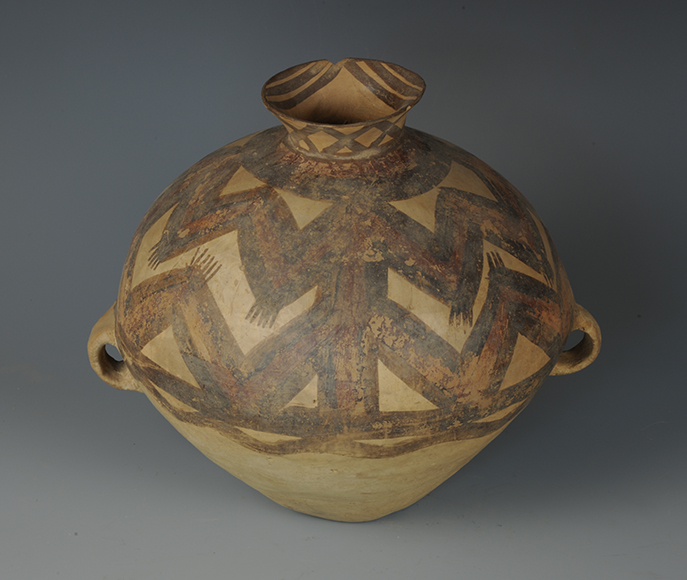 藏品-陶器-彩陶-农业与自然崇拜(神蛙、神人)-变体神人纹双耳壶 马厂文化类型 高22厘米 腹径24厘米