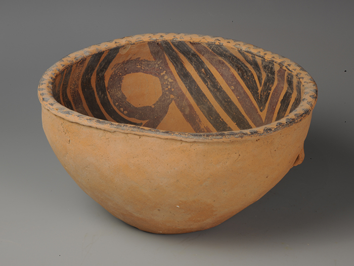 藏品-陶器-彩陶-农业与自然崇拜(河水)-涡纹齿纹双耳盆 半山文化类型 高11厘米 口径17厘米