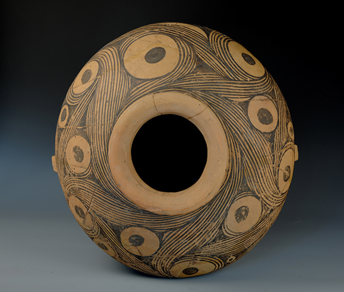 藏品-陶器-彩陶-农业与自然崇拜(河水)-旋涡纹圈点纹双耳瓮 马家窑文化类型 高57厘米 口径23厘米