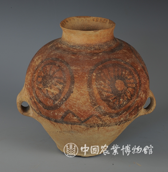藏品-陶器-彩陶-农业与自然崇拜(太阳)-太阳纹双耳壶 马厂文化类型 高22厘米 腹径22厘米