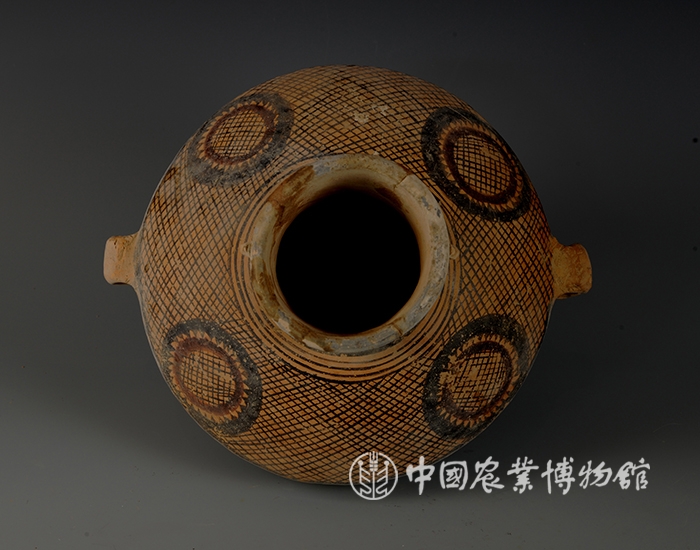 藏品-陶器-彩陶-农业与自然崇拜(太阳)-葵花纹网纹双耳罐 边家岭文化类型 高34厘米 腹径23厘米