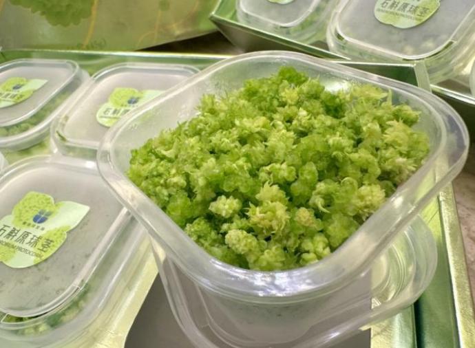 石斛原球茎是以铁皮石斛或霍山石斛的种子或茎部为原料,经组织培养获得原球茎,再经收集、干燥等工艺制成。它的口感细腻爽滑,带有淡淡的草本清香,除可泡茶、炖煮外,还广泛用于食品工业领域,能制成茶饮料、保健品、调味品等。《本草从新》称石斛可“平胃气,除虚热,安神定惊。疗风痹脚弱,自汗发热,囊湿余沥。长于清胃除热”。石斛原球茎作为石斛的重要衍生形态,同样具有这些功效。其主要成分包含石斛多糖、生物碱、氨基酸、微量元素等,保健作用显著,日常食用有助于增强免疫力、抗氧化、调节身体机能,对缓解疲劳、改善睡眠质量也有一定帮助。